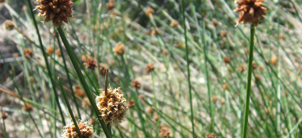 Perennial tufted rush to 1 m tall with erect stems and furry brown round seed heads. Hardy and rhizomatous, ideal for binding sandy soils, seaside plantings, or near pools. Tolerates brackish water and dry periods.