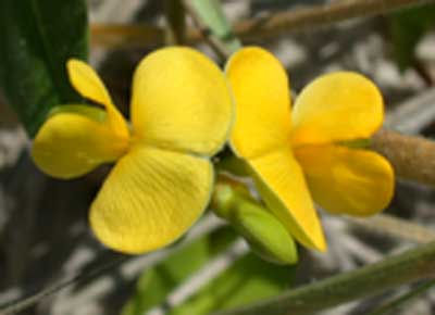 Prostrate trailing perennial vine. Very fast-growing, forming a large dense mat. Dark green foliage with pretty yellow flowers most of the year. Brown seed pods up to 6 cm long.